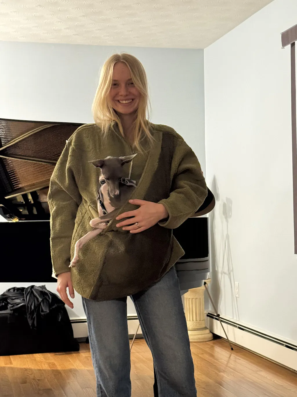 - A cozy fleece sweater and pet carrier in one, designed for pet lovers who want to stay close to their furry companions anytime, anywhere. With an extra-large kangaroo pouch, it comfortably fits cats, puppies, and other pets, keeping them safe, warm, and calm right next to you.