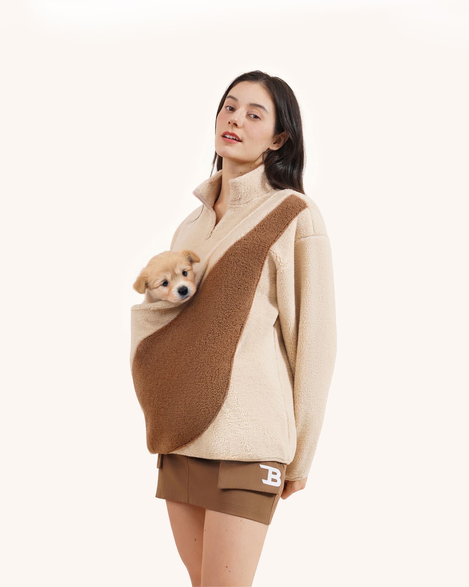 Beige, Unisex - Fleece Sweater with Kangaroo pouch pet carriers.